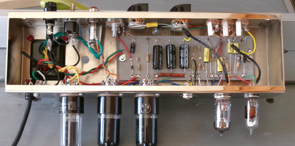 Just finished, Blonde Cyclone head. EF86 Preamp, 12AX7 phase inverter, a pair of EL84 power tubes and a NOS 5V4 (very rugged) rectifier tube.